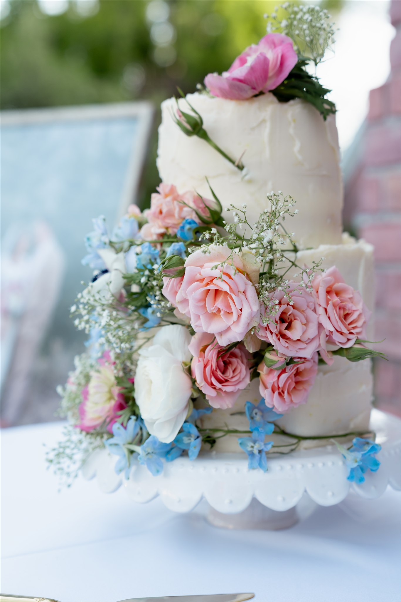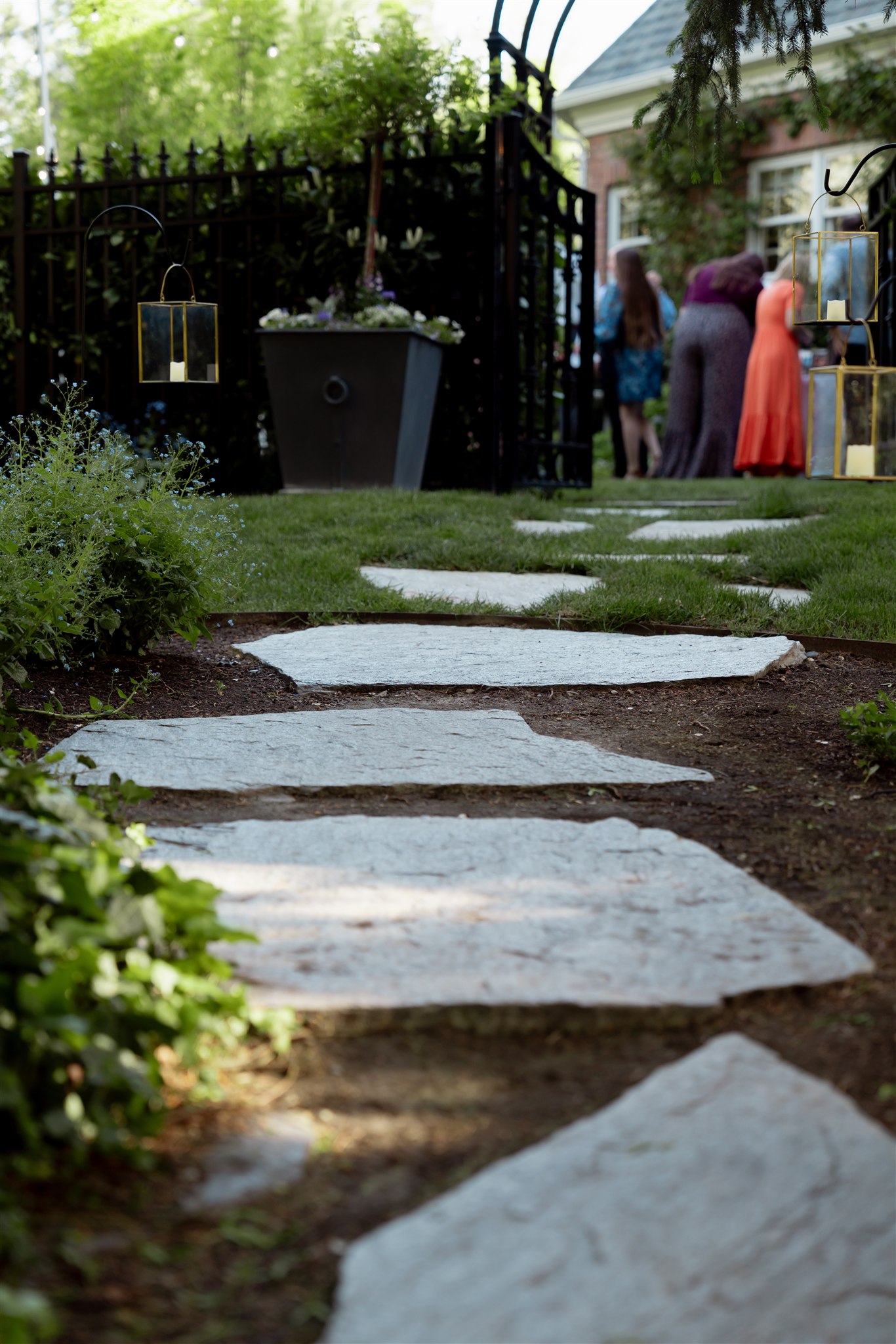 Guests drove up a quiet, tree-lined road before arriving at a large front gate. Beyond it, a circular driveway wrapped around a pond in front of the stunning red brick home. From there, a pathway through tall trees and lush gardens guided guests around the house to the backyard celebration.