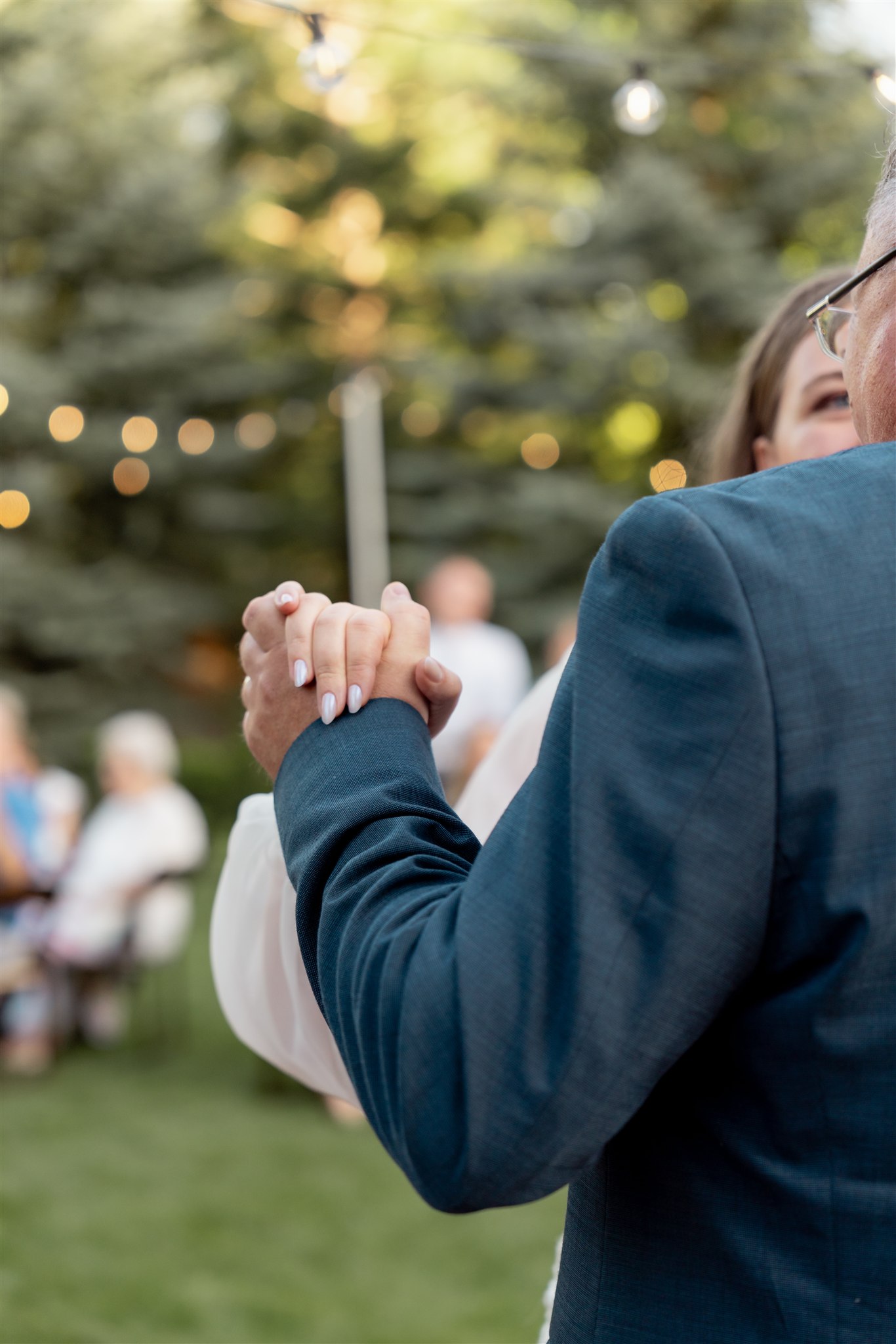 • a small wooden dance floor set beneath glowing string lights