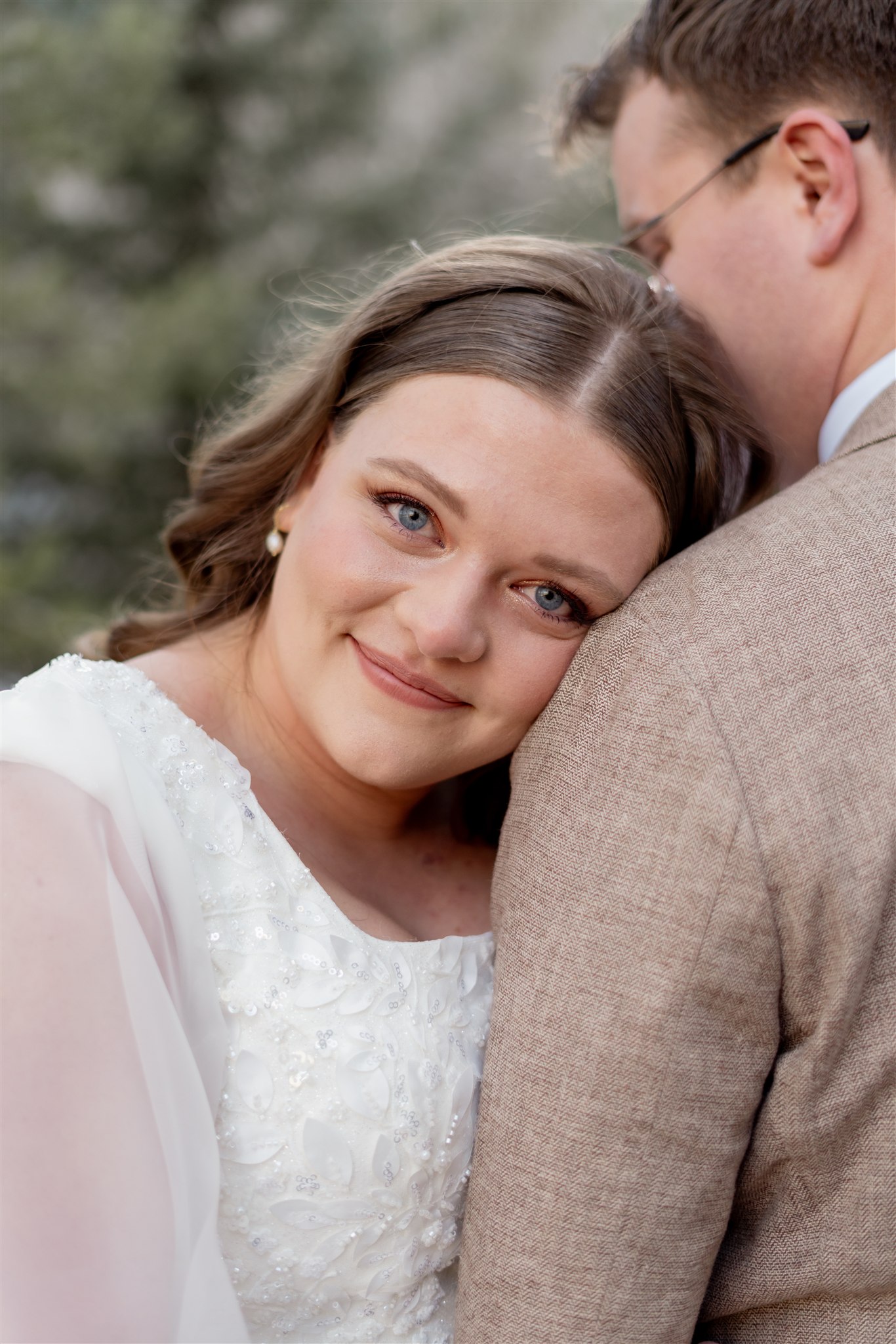 The embroidery echoed beautifully with her bouquet, which featured soft spring tones of pale blues, blush, and light pinks. Against the deep greens of the pine trees and the expansive mountain backdrop, everything felt incredibly cinematic.
